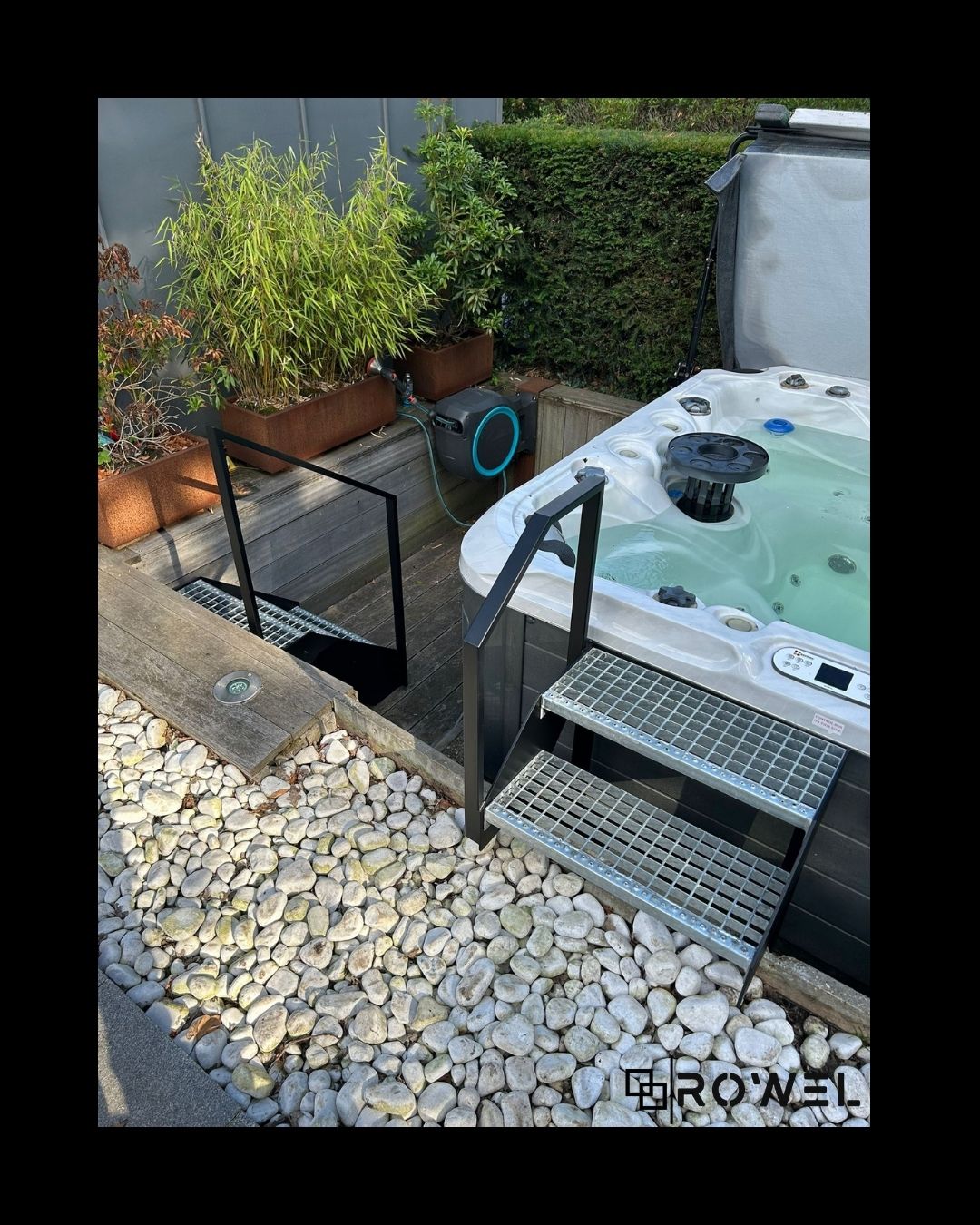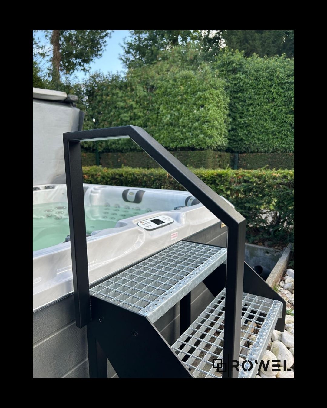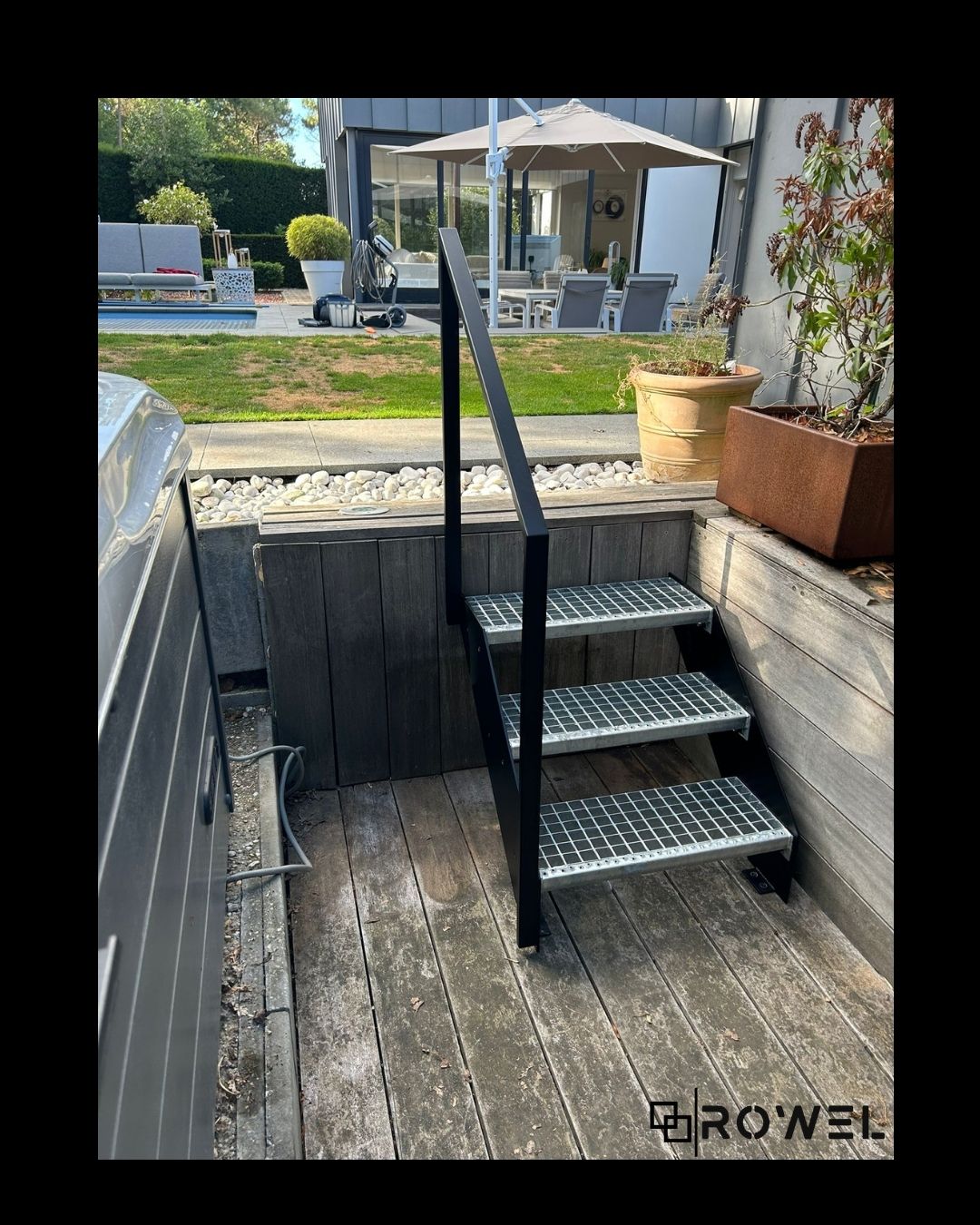 Deze buitentrap met leuning werd op maat ontworpen om vlot en veilig toegang te bieden tot de jacuzzi. De constructie sluit perfect aan bij de bestaande niveaus en omgeving, met aandacht voor gebruiksgemak en stabiliteit. Het geheel werd uitgevoerd in staal en afgewerkt voor duurzaam buitengebruik.